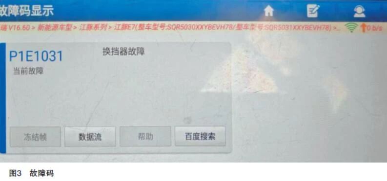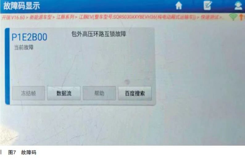 遂用诊断仪读取故障码,发现系统现在存在一个故障码为P1E2B00包外高压环路互锁故障且当前故障(如图7所示),由此基本确定故障点应该就在VCU本身了,遂订购VCU,到货更换后故障排除。