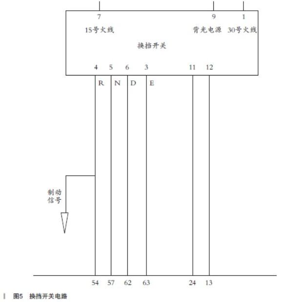 诊断仪读取的VCU故障码P1E1031换挡器故障,为当前故障(如图3所示),由此怀疑是否故障点就在换挡器执行元件本身?换挡器执行元件如图4 所示,该换挡器为一个电子信号开关,其上共有12个针脚,实际上使用的只有1 号、3 ~ 7 号、9号、11号、12号脚(如图5所示),而向VCU输入挡位信号的线路只有4号、5号、6号、3号脚,对应的挡位信号分别是R/N/D/E。