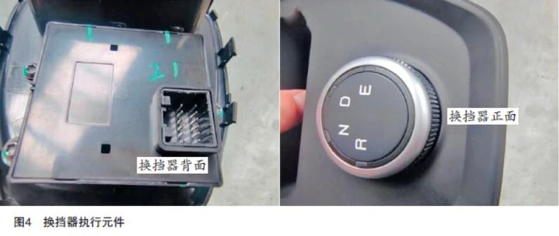 有了线路控制图,检查起来就简单了,测量挡位信号4个输出针脚与VCU之间的导通,相互之间是否存在短路,对电源线、地线之间是否短路,检查均没有发现问题。旋转换挡按钮,检测对应的线路电位信号均会变化,再将故障车辆挡位执行元件对换到同类型车上,同类型车辆换挡正常,至此排除了换挡执行元件的故障嫌疑了。