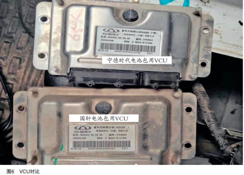 由于之前没有更换VCU的经验且没有备件库存,因此决定用其他车辆的旧件替换尝试下,但是没有同款电池包车型,只有宁德时代电池包的车辆,但与宁德时代的电池包使用的VCU外表和针脚完全一模一样(如图6所示)且软件/硬件均完全相同,只是外壳控制器后面多了两个宁德的字样以示区别。抱着试试看的心理,将宁德时代的VCU更换到该车型上来,再次打开点火开关,仪表挡位灯正常显示且不再闪烁,车辆也是无法上电。