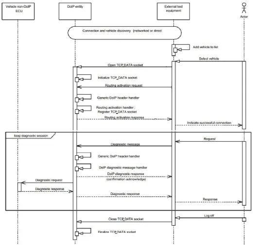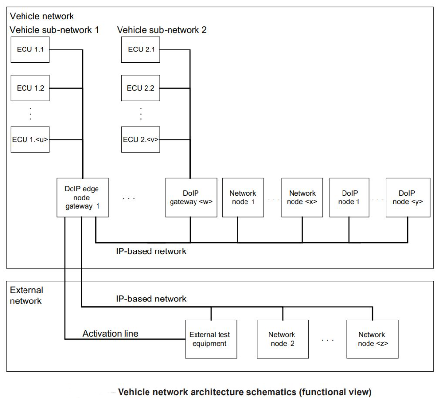 整个车辆网络由四个角色组成,外部测试设备作为客户端,对车内网的各个支持DoIP协议栈的ECU进行诊断。(部分CAN ECU通常挂载在MCU上,由MCU进行DoIP转DoCAN的路由)车外网的外部测试设备通过OBD-II与车内网的edge gateway进行通信,edge gateway用来使能车内网的DoIP功能。在路由打通后,发送的诊断数据根据目的地址的不同分别流向车内网的不同ECU。