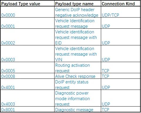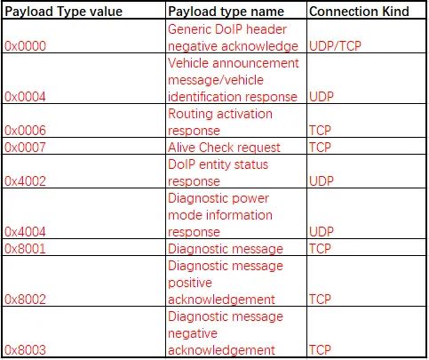 这里的负载是指的是DoIP协议的负载,当然当Payload type为诊断类型时,其负载除了DoIP自身的内容,还包含了UDS数据,供上层UDS模块进行进一步的解析。