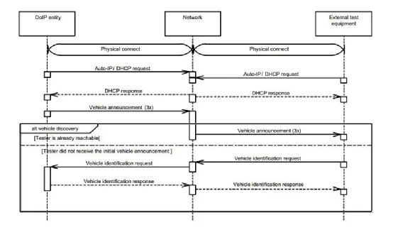 当DoIP实体和外部测试设备都连接到一个网络中时,它们会利用DHCP协议获得一个属于自己的IP地址。在网络中,路由器作为DHCP server,为新加入到该网络中的设备分配IP地址。在获取IP地址之后,有两种车辆发现的方法,如上图所示。一种方法是车辆主动上报自己的信息3次。如果测试设备没有收到车辆主动上报的信息,则会发送一个identification request,如果网络中有车辆的话,车辆对这个请求进行响应,测试设备便发现了被测车辆。